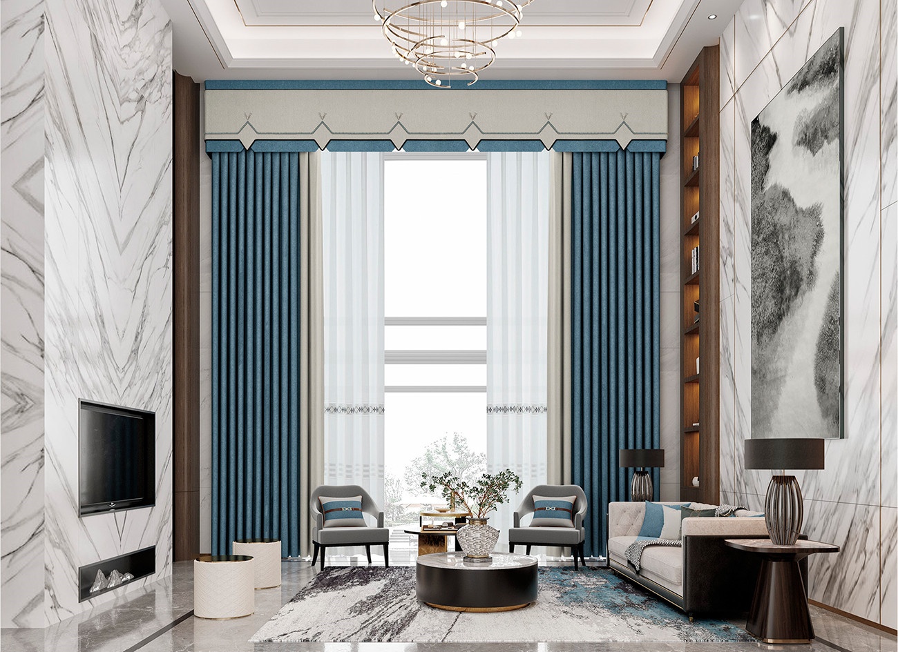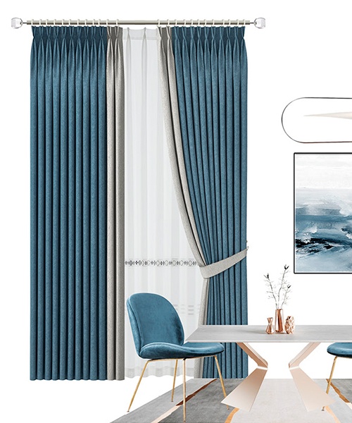 通過線條變化強調(diào)視覺差異,構(gòu)建出窗簾的視線落點,代爾夫特藍增加整個居室的質(zhì)感