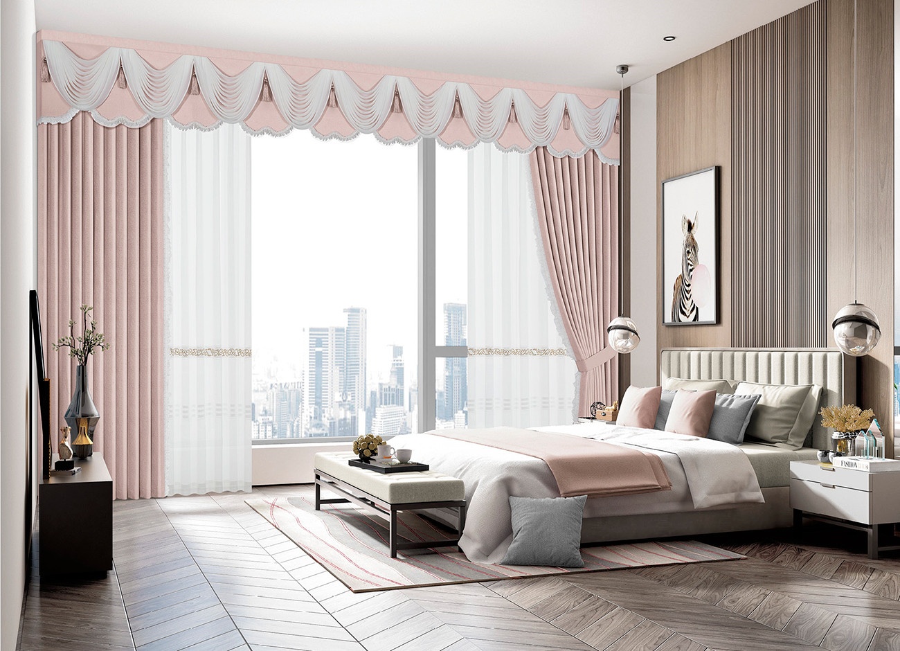 層疊的水波紗與嬌嫩櫻花粉仿佛初入宮廷的少女裙擺,生機與優(yōu)雅同行,讓空間也明媚起來