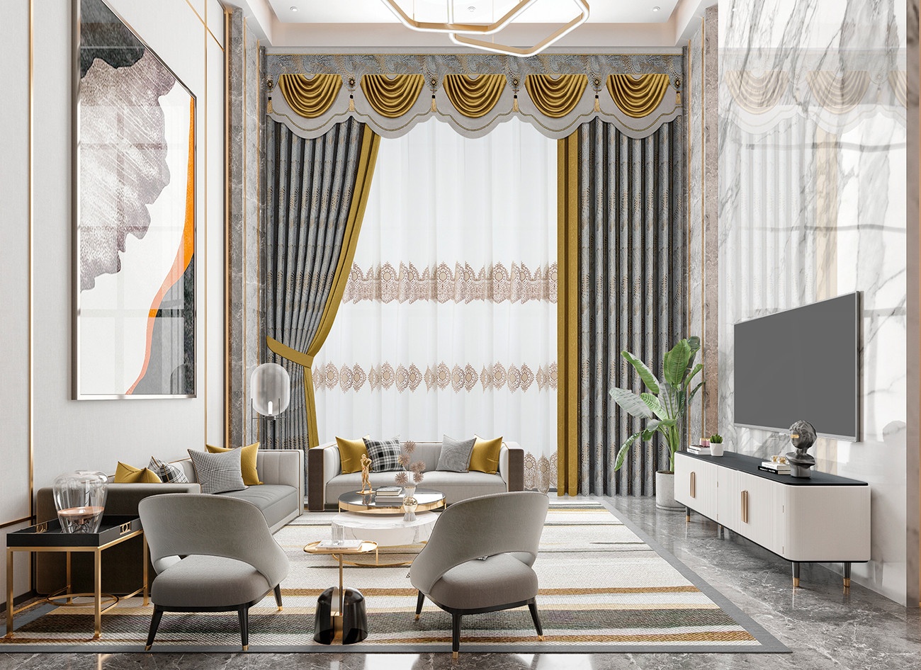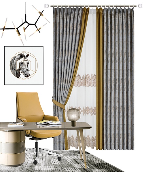 沉靜內(nèi)斂的高級灰搭配一抹時(shí)髦姜黃色,完美結(jié)合彰顯優(yōu)雅摩登的撩人誘惑。簾頭波形輪廓優(yōu)雅大氣,為空間平添一份婀娜情韻,成就—種休閑式浪漫。