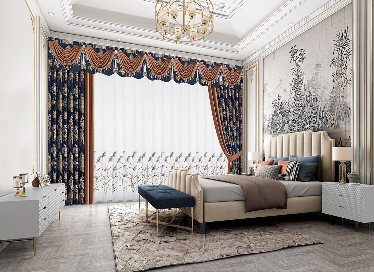 汲取花的靈感,綻放于面料之上,真實(shí)的筆觸靈活展現(xiàn)花的姿態(tài),搭配背景墻,如踏入一片花海叢林,空間更加生動。