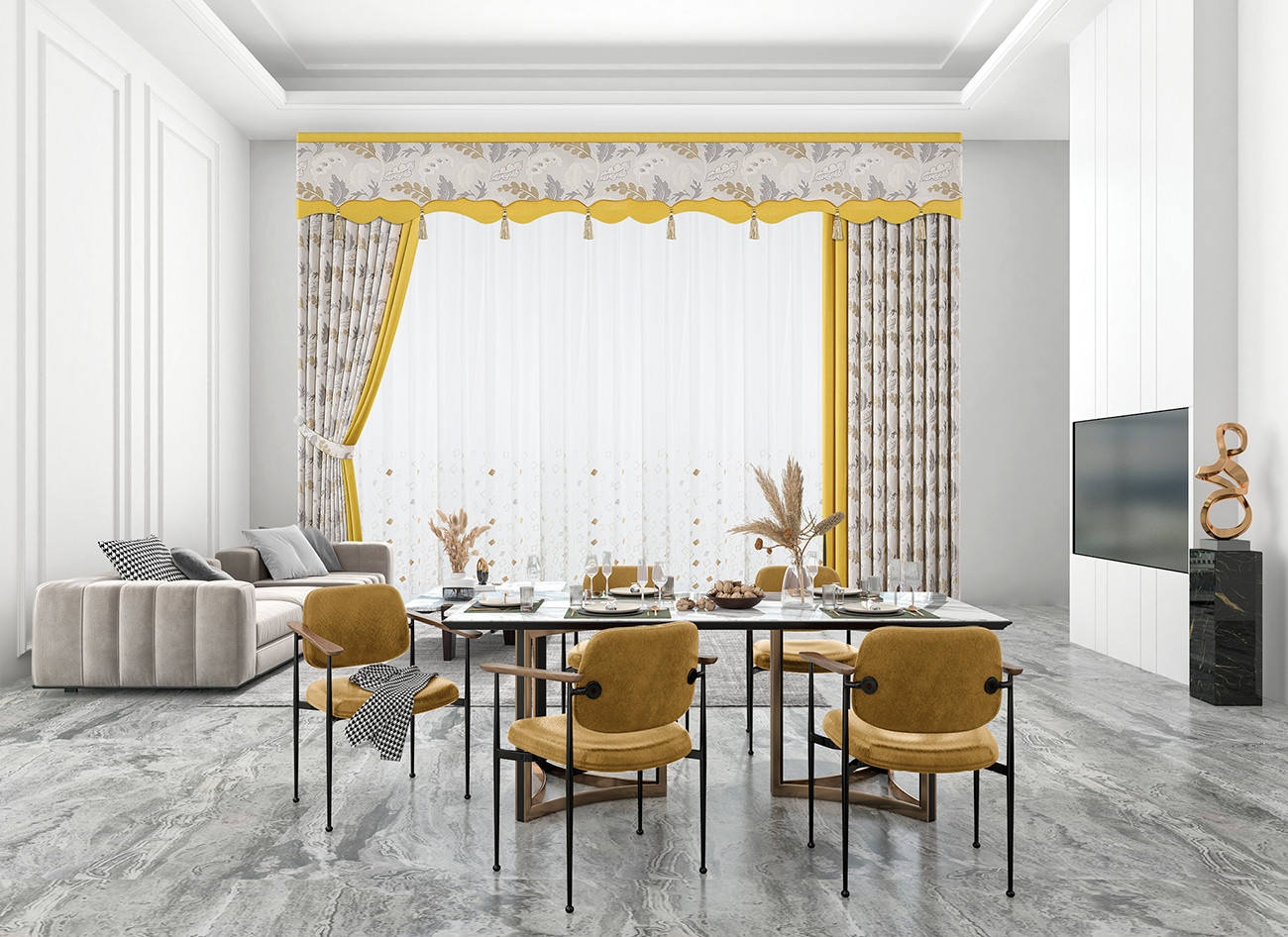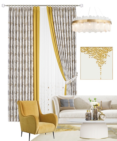 靈感來源于夏日盛開的枝葉,明亮的黃色如同夏日陽光,枝葉的蓬勃姿態(tài)展現(xiàn)積極的生活態(tài)度,空間不再冰冷,而是溫暖起來。